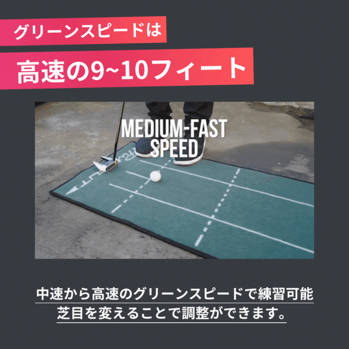 PuttOUTのパターマットはスティンプメーター10で設定されており、コースにいなくても、中速から高速のグリーンで練習することができます。