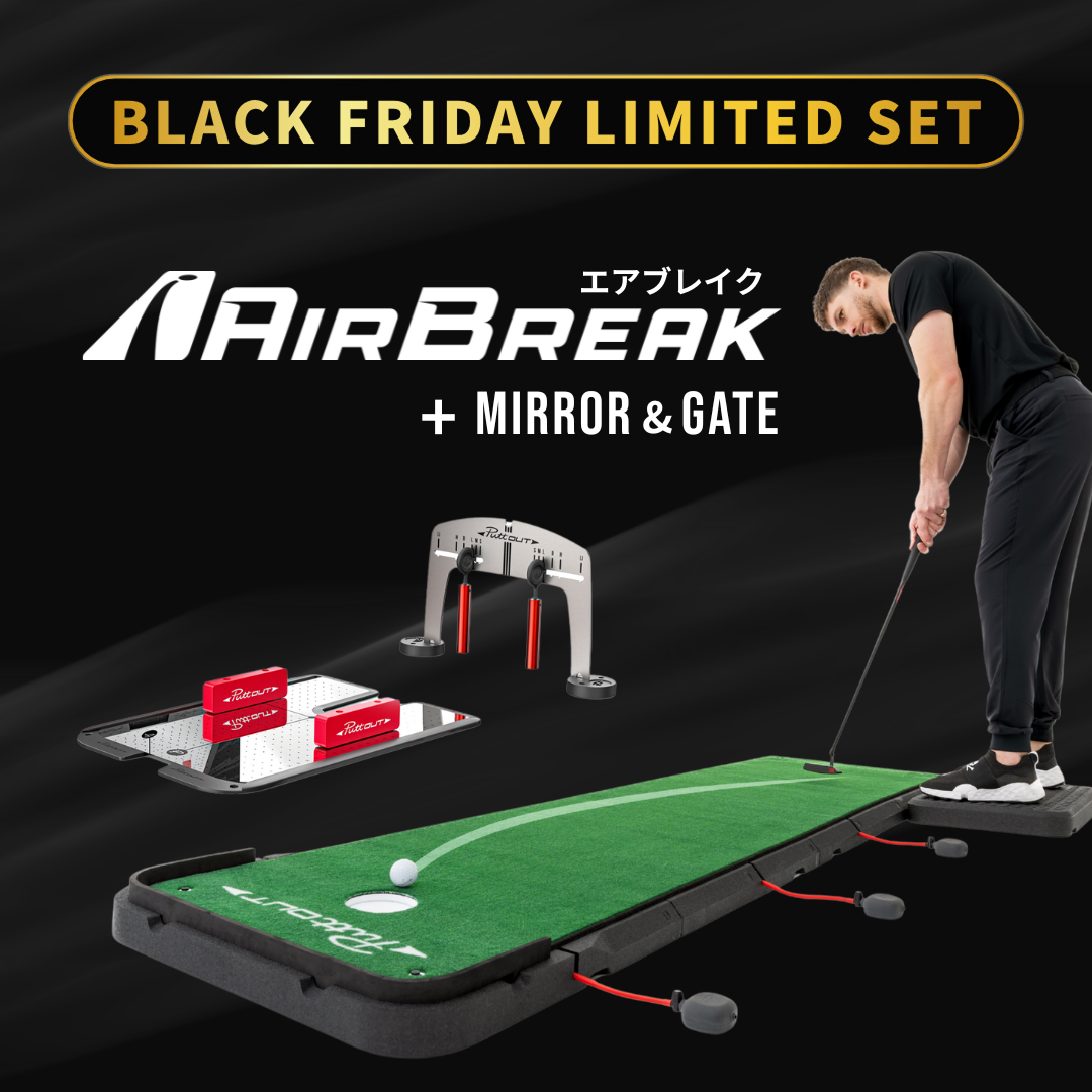 自宅で“傾斜パット”が練習できる革新的パターマット Air Break と、正しいアドレスをつくる最新ミラー Mirror&Gate がセットに。ブラックフライデー限定の特別価格で、方向性 × フェース角 × 傾斜対応の総合パッティング練習が実現します。